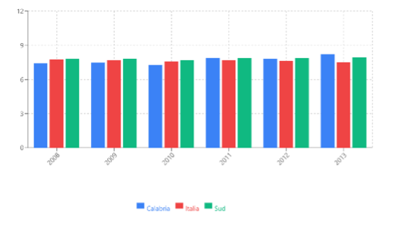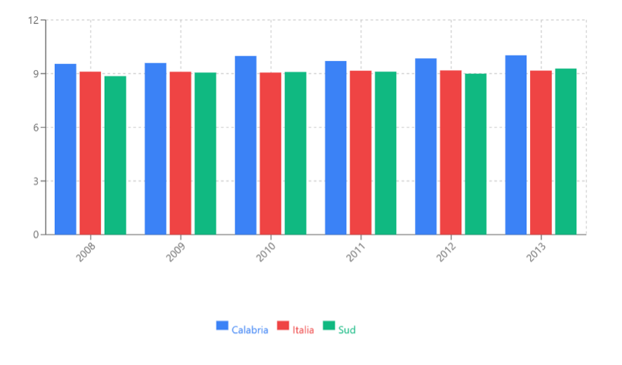 Valori in linea o superiori alla media: per l'intero periodo, la Calabria si mantiene allineata o leggermente sopra le medie di Italia e Sud, in particolare nel 2013.